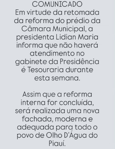 Comunicado de Recesso de Carnaval da Cmara Municipal de Olho Dgua do Piau